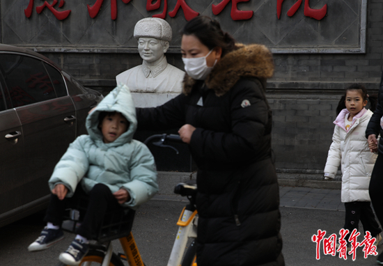 2023年2月16日,北京人定湖公园北门外,家长带着幼儿园放学的孩子从一尊汉白玉雷锋半身雕像旁经过。中青报·中青网记者 陈剑/摄