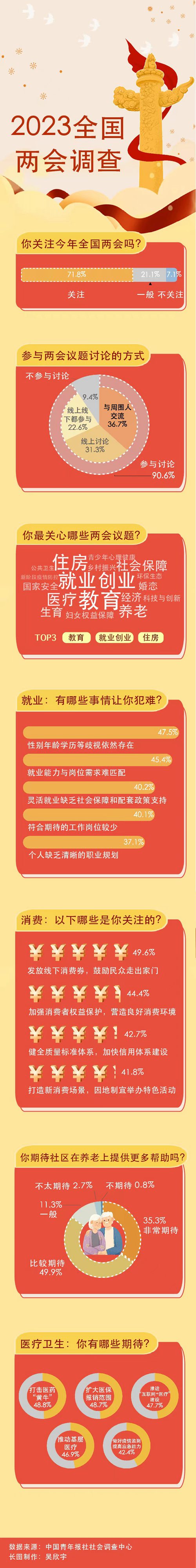 在全国两会召开前夕,中国青年报社社会调查中心联合问卷网(wenjuan.com)进行了一项题为“两会在即,你最关心哪些议题”的全国两会青年期待调查,共有2201人参与。调查显示,90.6%的受访者表示会参与两会议题讨论,教育是期待度最高的两会议题。