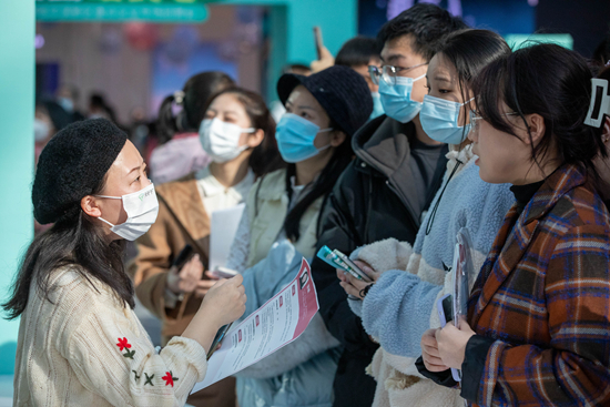 3月4日,在2023哈尔滨新区重点企业专场招聘会现场,求职者在与用人单位工作人员交流。当日,“2023哈尔滨新区重点企业专场招聘会”在黑龙江省哈尔滨市融创茂举办。新华社记者 张涛/摄