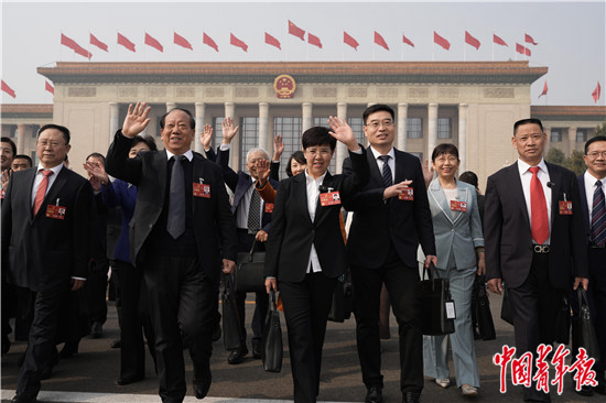 3月5日,十四届全国人大一次会议开幕会结束后,代表们走出人民大会堂,向记者挥手致意。中青报·中青网记者 李隽辉/摄