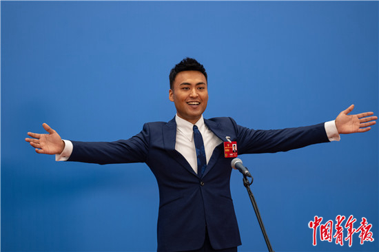 3月7日上午,北京,人民大会堂新闻发布厅,全国政协委员、新疆新的社会阶层人士联谊会副会长海尼扎提张开双臂,欢迎大家来新疆。他提到自己用短视频记录家乡生活的经历,希望更多年轻人加入新媒体行业,创作优质内容,为正能量发声。当日,全国政协十四届一次会议第二场“委员通道”在人民大会堂新闻发布厅举行,8名委员走上通道回答记者提问。中青报·中青网记者 李峥苨/摄