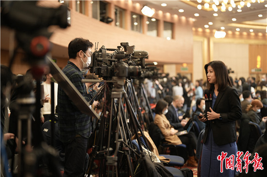 3月7日上午,北京梅地亚中心,十四届全国人大一次会议记者会前,一名电视记者在做口播。中青报·中青网记者 李隽辉/摄