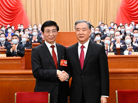 3月10日,全国政协十四届一次会议在北京人民大会堂举行第三次全体会议。当会议主持人宣布王沪宁当选政协第十四届全国委员会主席后,汪洋起立祝贺,与王沪宁热烈握手。新华社记者 李学仁/摄