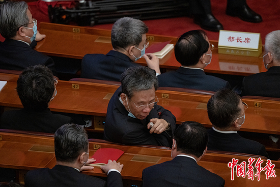 3月12日,北京人民大会堂,十四届全国人大一次会议第五次全体会议上,财政部部长刘昆(二排中)与住房和城乡建设部部长倪虹交流。