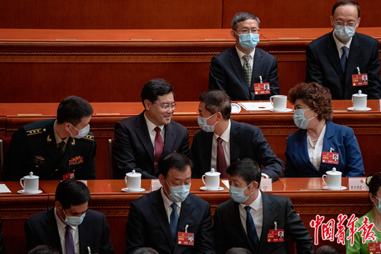 3月12日,北京人民大会堂,十四届全国人大一次会议第五次全体会议上,外交部部长秦刚(二排左二)被任命为国务委员后,曾任中央人民政府驻香港特别行政区联络办公室主任的骆惠宁(二排右二)向他表示祝贺。