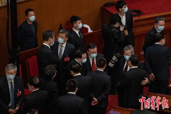 3月12日,北京人民大会堂,十四届全国人大一次会议举行第五次全体会议,会议间歇,部长们在会场交流。