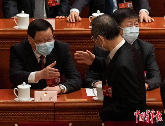 3月11日上午,北京人民大会堂,十四届全国人大一次会议第四次全体会议上,前一日当选全国政协副主席的周强(中)与全国人大代表应勇(左)打招呼,应勇在当天的会议中当选最高人民检察院检察长。中青报·中青网记者 李隽辉/摄