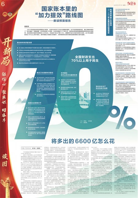 3月7日,《中国青年报》两会特刊推出可视化版面解读预算报告中的重要数据“70%”——连续5年全国财政支出70%以上用于民生。通过突出这一大数据,凸显本届政府执政为民的理念。整版通过数据的变化,解读预算报告,呈现“积极财政政策提力增效的路线图”。