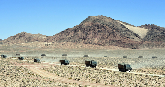 空降兵某旅运输连车辆编队在戈壁中行驶。陈立春/摄