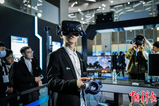 3月17日,北京理工大学良乡校区,第十三届“挑战杯”中国大学生创业计划竞赛,一名男生体验“挑战杯·元宇宙”大型沉浸式数字交互空间。中青报·中青网记者 赵迪/摄