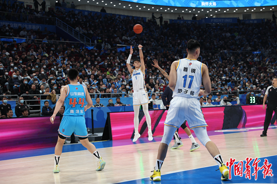 3月19日,北京首钢男篮在五棵松体育馆迎战山东队,最终北京首钢以112∶90大胜。图为小将曾凡博外线远投。中青报·中青在线见习记者 罗征/摄
