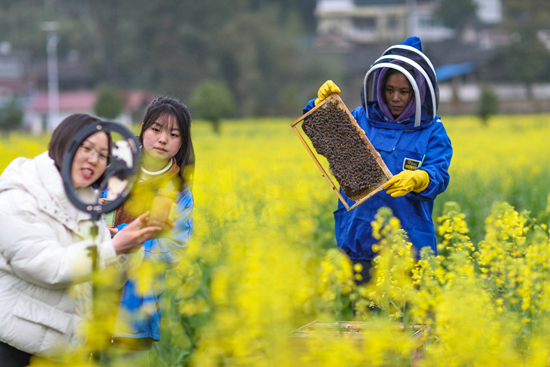 3月18日,岑巩县中等职业技术学校电子商务专业的学生在油菜花地里学习直播销售蜂蜜。