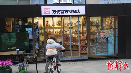 2月2日,在北京望京小街,一个男孩骑着车在手办店门前张望。中青报·中青网见习记者 赵丽梅/摄