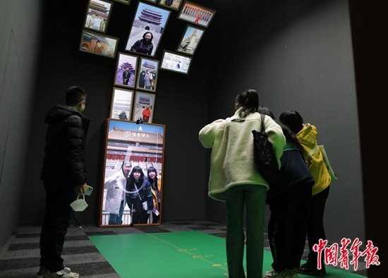 3月27日,北京首都博物馆“辉煌中轴”展览现场,“我与中轴线的故事”互动空间,记者们拍照,留下与中轴线上标志性建筑的合影。当日,“辉煌中轴”展览在这里对媒体开放预展。据悉,该展览是为纪念北京建都870周年而举行的,展览共分壮美中轴、文化中轴、永恒中轴3个部分,对中轴线的壮美秩序、思想源流、历史发展、公众化进程和保护工作进行了系统的精彩阐释。展览将于3月28日正式对公众展出。中青报·中青网记者 陈剑/摄