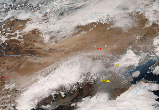 风云四号气象卫星监测今年以来强度最强沙尘过程的图像。中国气象局供图