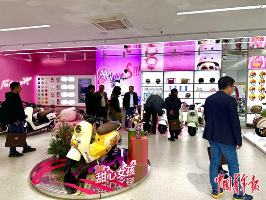 为顺应消费者需求的转型和消费心智的升级,电动自行车制造商未来将大力发展以智能化、高端化和个性化为代表的新一代高端车型,提升产品竞争力和品牌形象。图为近日在郑州开业的爱玛Miss大小姐女性主题店。