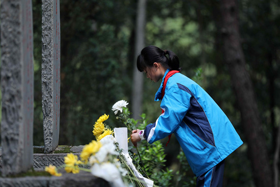 4月3日,在贵州省黔东南苗族侗族自治州锦屏县龙大道烈士陵园,一名少先队员向红军烈士墓敬献鲜花。杨晓海/摄(新华社发)