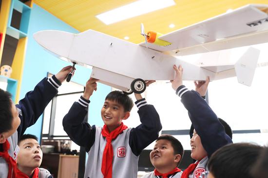 4月3日,学生在科技节活动上展示自己的作品。当日,山东青岛西海岸新区太行山路小学举办第三届校园科技节活动,通过科技展演展示、科技小制作等,提升学生的创新和动手能力,让学生近距离感受科技魅力。张进刚/摄