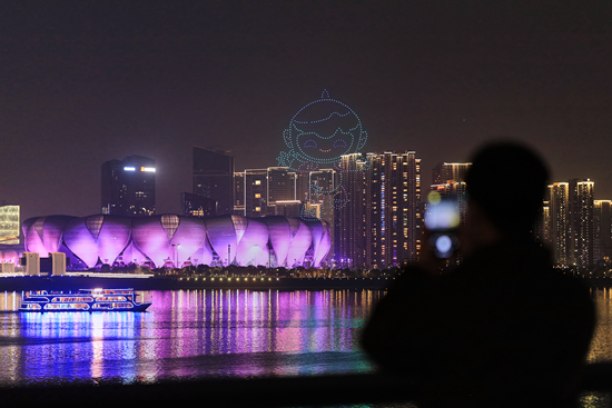 3月7日,杭州亚运会倒计时200天,游人在拍摄无人机表演。视觉中国供图