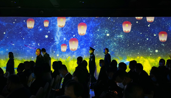 一盏盏写着逝者名字的祈福灯从屏幕上升起,群众可以通过扫二维码,通过声音、文字、图片等形式与家人实时共享,线上线下虚实交互。