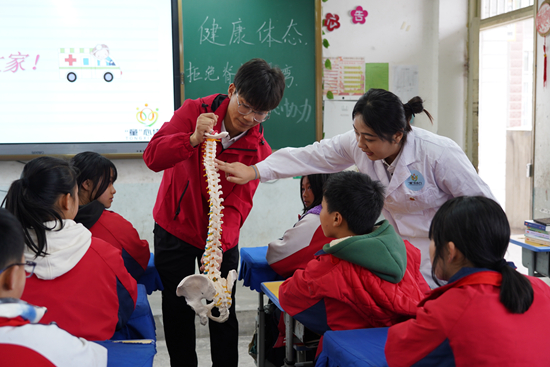 丁禹承的任务是给同学们开展科普讲座,辅助其他志愿者给孩子们进行脊柱侧弯的检查。