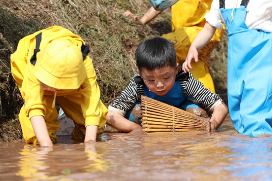 4月10日,四川省广安市武胜县东方红幼儿园的小朋友在龙女镇的稻田里抓鱼。春日里,不少学校开展田间课堂活动,孩子们走进田间地头,体验劳动带来的快乐。夏俊林/摄(新华社发)