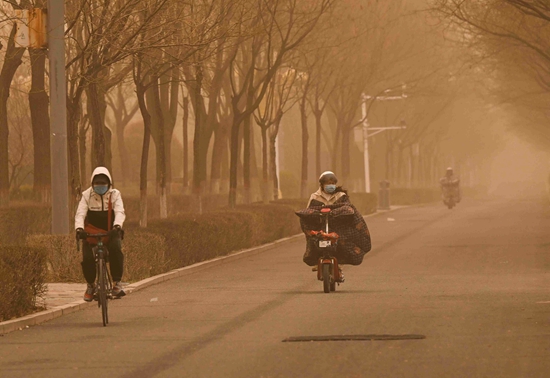 4月10日,市民在呼和浩特市街道上骑行。当日,我国北方多地出现沙尘天气。新华社记者 刘磊/摄