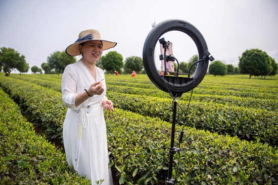 4月11日,在湖南省长沙市望城区乌山贡茶基地,工作人员通过直播推销茶叶。