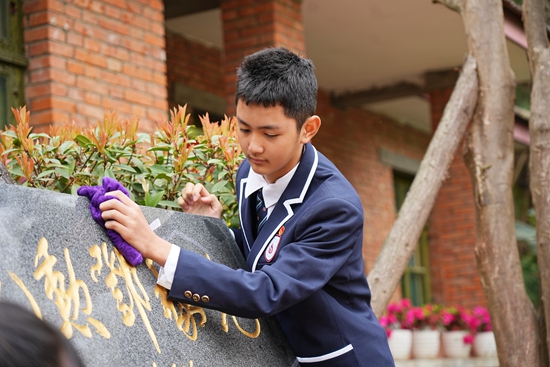 四川省绵阳市绵阳外国语学校学生近日前往位于梓潼县的两弹城开展“礼敬先辈元勋 传承红色精神”主题教育活动。图为学生擦拭两弹元勋邓稼先的雕塑。20世纪60年代,三线建设时期,中国工程物理研究院内迁梓潼,在此完成了原子弹、氢弹的设计方案,因此这里被称为“两弹城”。团四川省绵阳市委供图