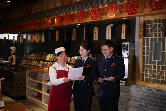 国家税务总局晋城市城区税务局组建助企纾困专家团队,主动为山西省晋城市康兴苑清真食府等多个少数民族企业送服务、解难题、办实事,图为青年税务干部开展相关涉税政策辅导。吴守京 摄影报道