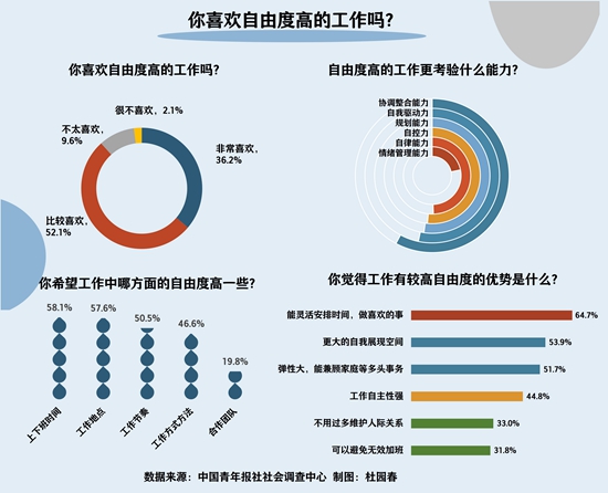 上周,中国青年报社社会调查中心联合问卷网(wenjuan.com),对1242名受访青年进行的一项调查显示,88.3%的受访青年喜欢自由度高的工作。受访青年认为,高自由度工作更考验协调整合能力、自我驱动力和规划能力。76.9%的受访青年表示高自由度工作会让自己在工作中更有成就感。