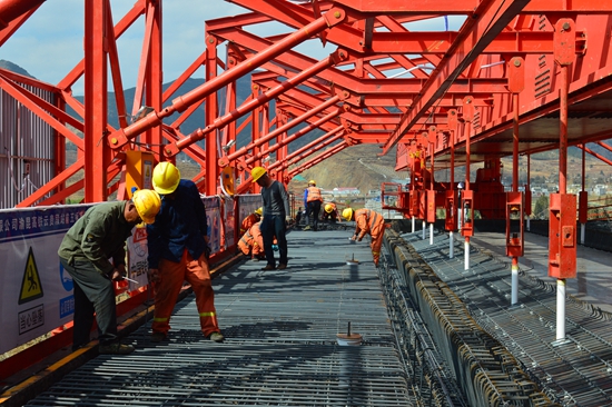 随着周家村特大桥首榀移动模架现浇梁桥梁完成浇筑,渝昆高铁的建设开始提速。图为建设者们在周家村特大桥上进行钢筋绑扎作业。