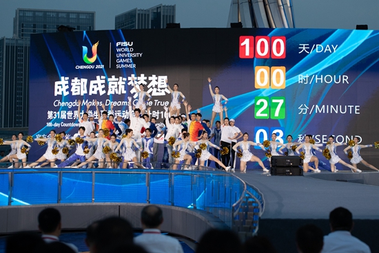 4月19日晚,“成都成就梦想”第31届世界大学生夏季运动会倒计时100天主题活动在成都东安湖体育公园火炬塔广场举行,标志着成都大运会正式进入倒计时100天冲刺。汪龙华/摄