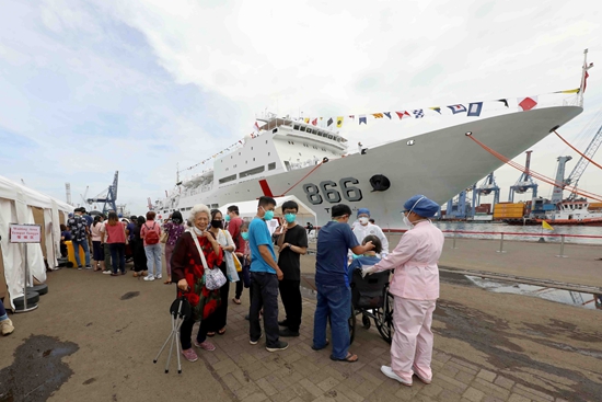 2022年11月11日,“和谐使命-2022”任务医疗服务在印尼雅加达丹戎不碌港码头和“和平方舟”号医院船上同时如期展开。图为医疗服务现场。蒲海洋/摄