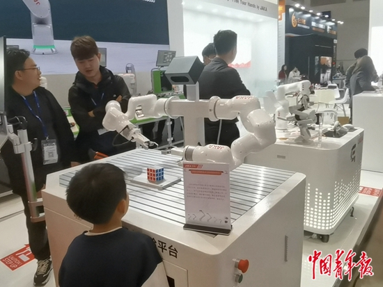 第58·59届高博会现场,智能机器人正在拼魔方,引来了一名儿童驻足观看。中青报·中青网记者 张渺/摄