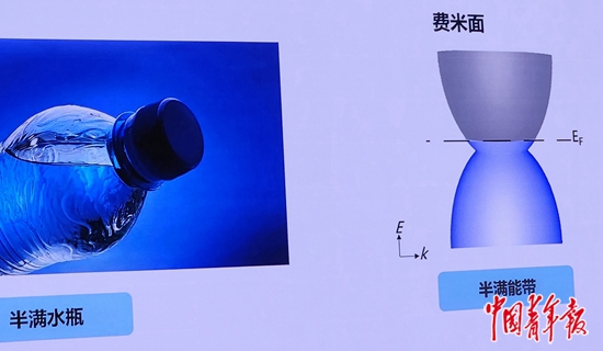 图为“费米面”与半满水瓶中的水表面对比。中青报·中青网记者 王烨捷/摄
