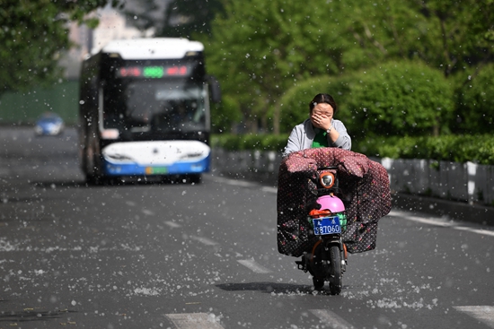 4月17日,太原,市民在漫天飞舞的杨絮中出行。视觉中国供图