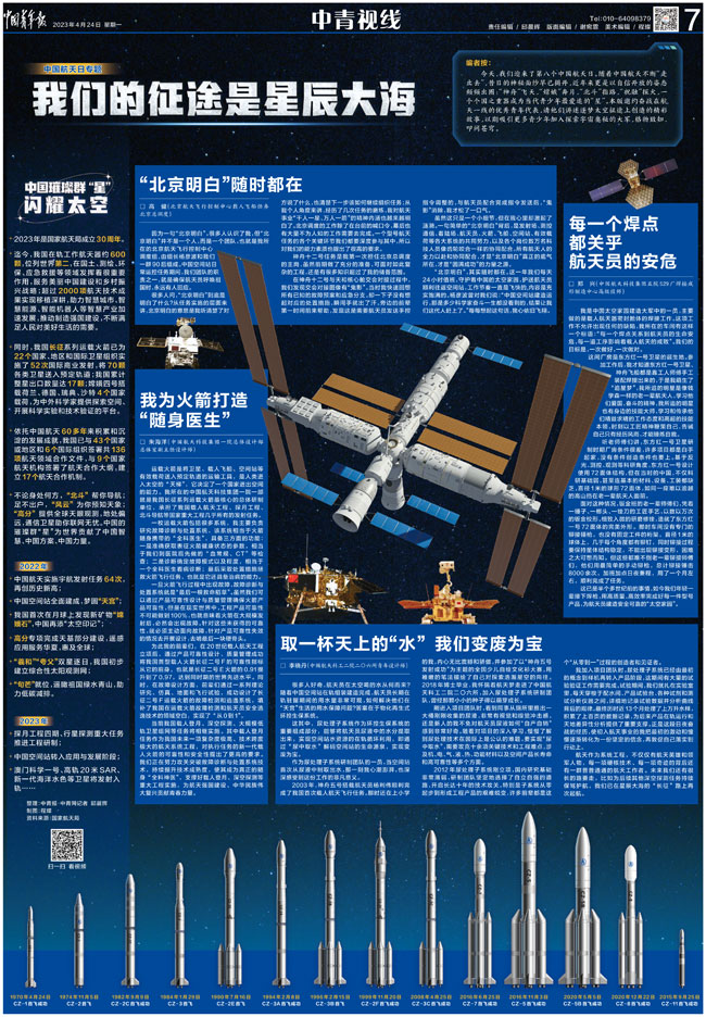 今天,我们迎来了第八个中国航天日。随着中国航天不断“走出去”,昔日的神秘面纱早已揭开,近年来更是以自信开放的姿态频频出圈:“神舟”飞天,“嫦娥”奔月,“北斗”指路,“祝融”探火,一个个国之重器成为当代青少年最爱追的“星”。本版邀约奋战在航天一线的优秀青年代表,请他们讲述逐梦太空征途上创造的精彩故事,以期吸引更多青少年加入探索宇宙奥秘的大军,格物致知、叩问苍穹。