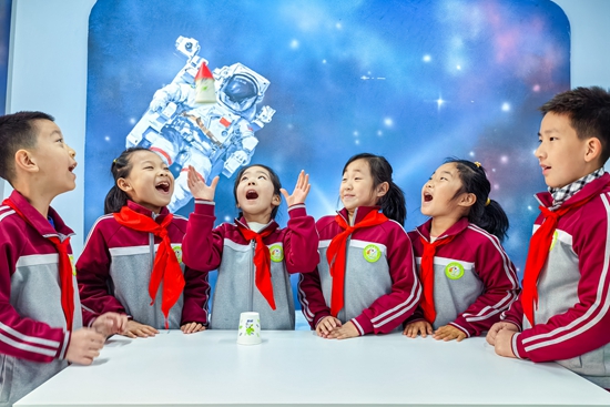 4月24日,在山东青岛徐水路小学科技教室,孩子们体验“纸杯火箭”实验的乐趣。当日是中国航天日,形式多样的航天主题活动为人们普及航天知识,激发孩子们的航天梦想。张鹰/摄(新华社发)