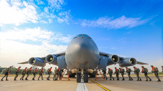 2022年9月,八连官兵进行大飞机伞降实跳训练,锤炼特战队员立体突击能力。胡雪峰/摄