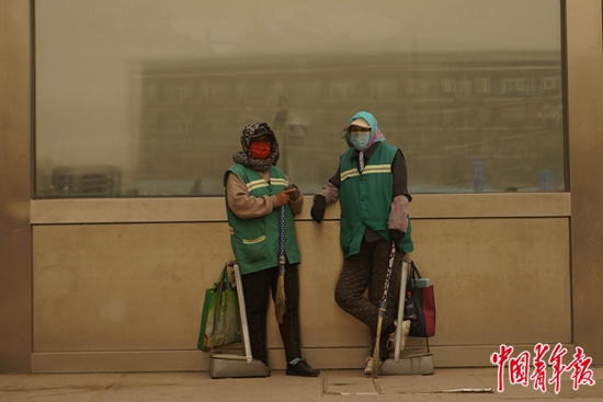 4月19日,内蒙古包头,沙尘暴来时,包头火车站的两名清洁工在墙边躲避风沙。