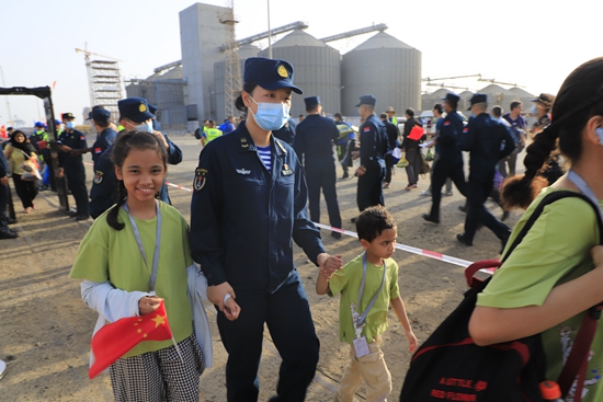 当地时间4月26日,海军军舰赴苏丹紧急撤离我在苏丹人员。图为海军官兵牵着儿童通过安检。丁家兴/摄