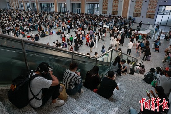 5月1日下午,山东淄博,淄博站候车厅内不少旅客席地而坐。近几个月,淄博烧烤热度持续攀升,“五一”假期成为游客“进淄赶烤”的高峰期。中青报·中青网记者 曲俊燕/摄