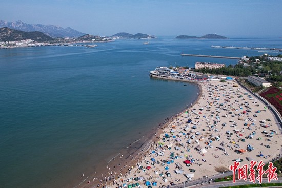 5月1日,山东青岛,崂山沙子口休闲广场的沙滩上搭满了帐篷。近年来,这里作为青岛的小众景点在社交平台上走红。(无人机照片) 中青报·中青网记者 程璨/摄