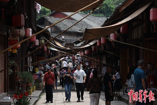 5月2日中午,四川省泸州市合江县尧坝镇,游客体验古街风情。尧坝古镇地处川渝黔结合部,农历的“三、六、九”是这里赶场的日子,但“五一”小长假期间,尧坝古镇天天都是赶场的气氛,一公里长的古街上游客络绎不绝。中青报·中青网记者 王鑫昕/摄