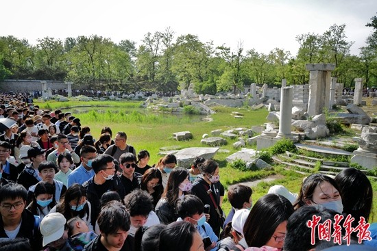 4月29日是“五一”假期的首日,在北京圆明园遗址公园的西洋楼遗址,来自各地的游客“人贴人”式排成长队,在游览线路中缓慢移动。密密麻麻的人群队伍中不乏头戴“玲娜贝尔”造型遮阳帽的小学生、举着自拍杆一边调整角度一边拍摄的女青年,还有拉着外孙的手讲解历史的老爷爷。