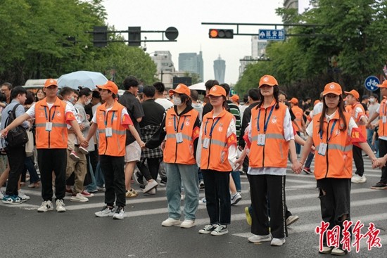 5月3日,浙江杭州,延安路和平海路交叉口,“最美人墙”志愿服务队组成“X”型对角斑马线,让市民和游客用最短路线穿过马路。“五一”小长假期间,西湖景区日均客流量超过80万人次。延安路和平海路交叉口靠近商场和西湖,作为杭州最热闹的十字路口,节假日人流量激增。中青报·中青网记者 张玉佳/摄