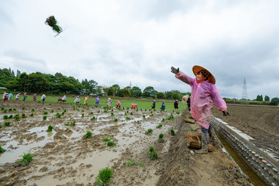 5月9日,在四川省崇州市道明镇协和社区,农民向一片高标准农田里抛水稻秧苗,以方便其他农民插秧。