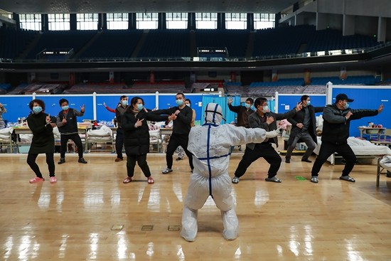 2020年2月21日,湖北省武汉市洪山体育馆方舱医院内,青海省互助县中医院高晓燕护士正在带患者练习八段锦。鲁冲/摄