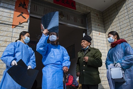 2023年1月11日,湖北省黄冈市黄梅县孔垄镇邢圩村,村医邢锦辉(左一)和同为医生的丈夫杨盛权(左二)、女儿杨进文(右一)利用午休时间一起看CT片,为一名感染新冠病毒后发现肺结节的村民会诊。潘松刚/摄